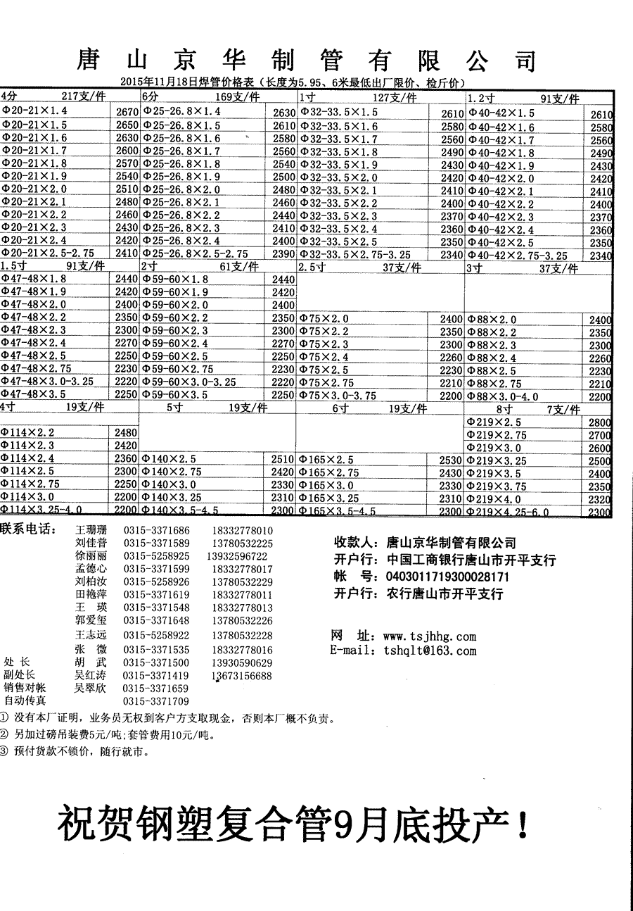 唐山京华2015年11月18日焊管价格表